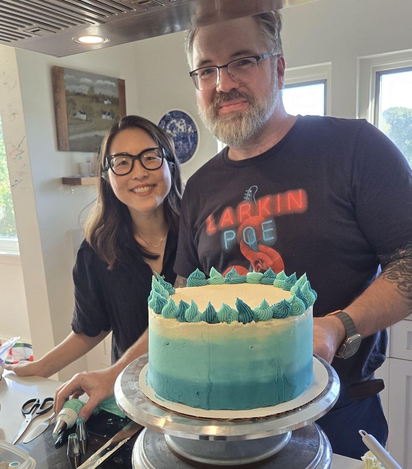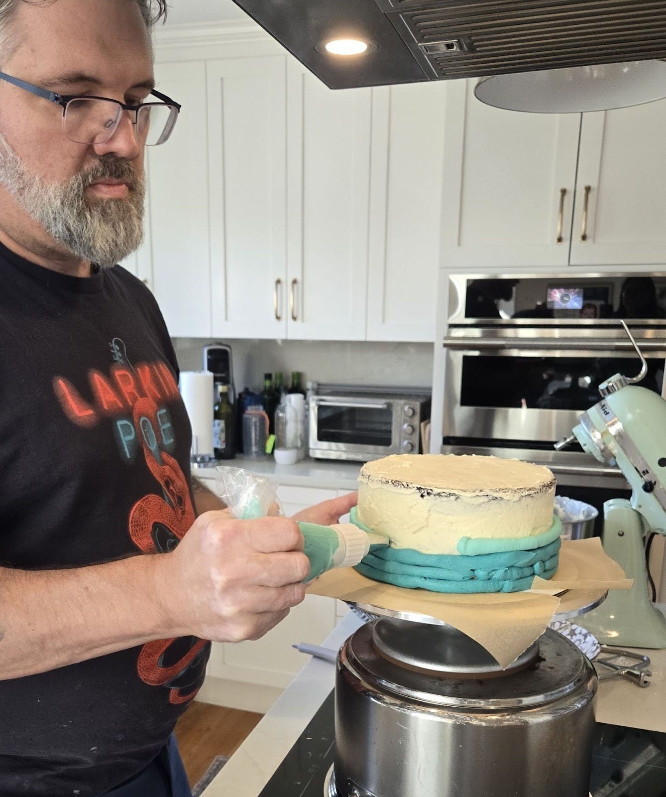 and I were texting about my Mom’s massive birthday cake. She shared that her husband Nicco is a savvy baker—as in, he is the person who will watch Great British Bake Off then actually make Prue Leith’s chocolate caramel hobnobs—but newer to cakes. He was working on a cake and commented that he wished he could level up his cake decorating skills. Morra asked whether I would be willing to give Nicco a cake decorating lesson for his birthday in September.Like pretty much everything I have done in the past 20 years, I am not trained to teach cake decorating (though I did give a cake tutorial live during the pandemic LOL). However, I thought this was such a clever, creative birthday idea and told Morra that if she thought it would be fun and useful for Nicco, I was game. We put it on the calendar and in the interim I ran flavors + a cake concept by her (how to make a fancy looking cake with simple techniques) and made a plan. And then on a perfect fall Saturday, I showed up at their house with a couple of bags of gear and prepared items (cakes, fillings). The gift was a surprise, and as soon as Nicco realized what was happening, he washed his hands and was ready to dive in.